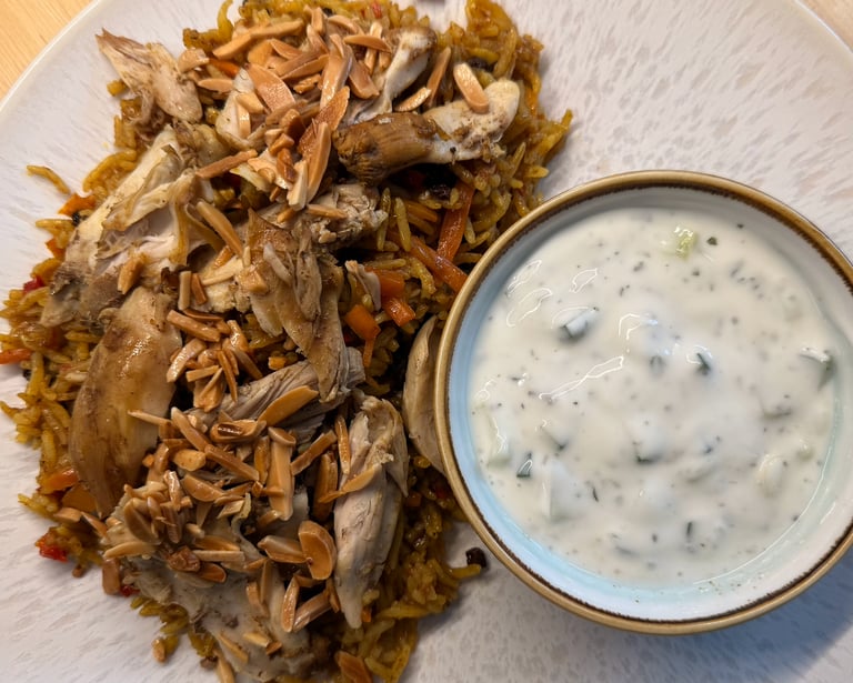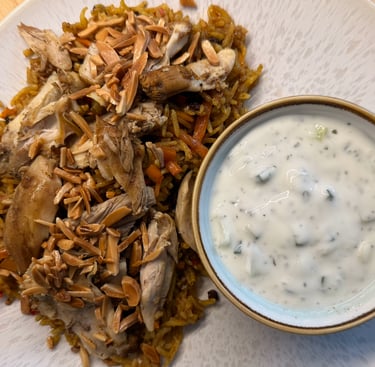 Poulet en morceaux et son bouillon à la cardamome, cannelle et laurier,