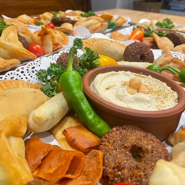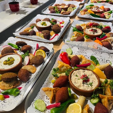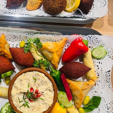 Samboussik au fromage, Samboussik à la viande, Kibbeh, Kibbeh Rubis, Fatayer épinard, Falafel, Taboulé, Olives, Feuilles de vigne farcies, etc