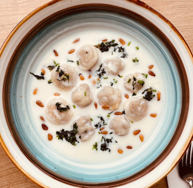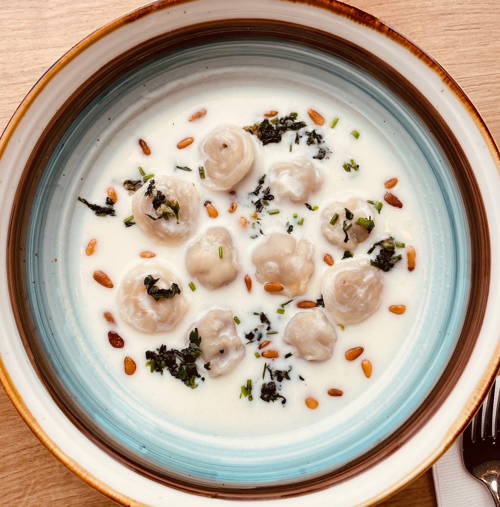 sauce yaourt, coriandre fraîche et pignon de pin