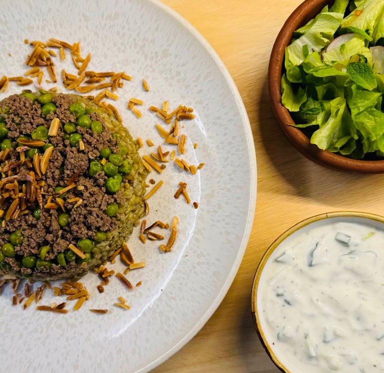 Riz aux épices, viande hachée et amandes